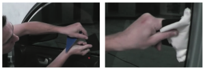 Con la otra mano el escurridor de goma en posición vertical y comenzando desde arriba lo vamos a deslizar de derecha a izquierda (o viceversa) sin dejar “rastro”(*). De esa forma nos aseguramos que no queden pequeñas partículas de suciedad en el vidrio y que en el momento de pegar el film no haya marcas notorias.